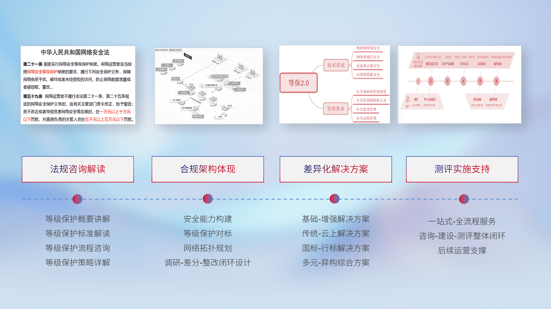 通过专业的法律咨询解读、、、合规架构体现、、、、差异化解决方案、、、测试实施支持等服务,,为客户量身打造等保合规体系。。。